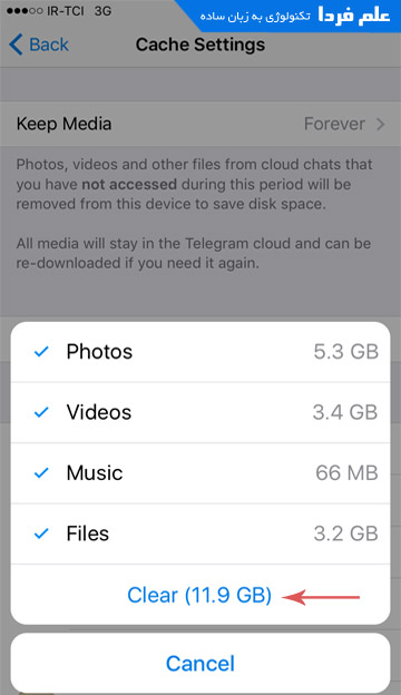 روش پاک کردون کش تلگرام در iOS هم دقیقا مثه اندرویده فقط یکم شکل و شمایل منیو ها با هم فرق داره .