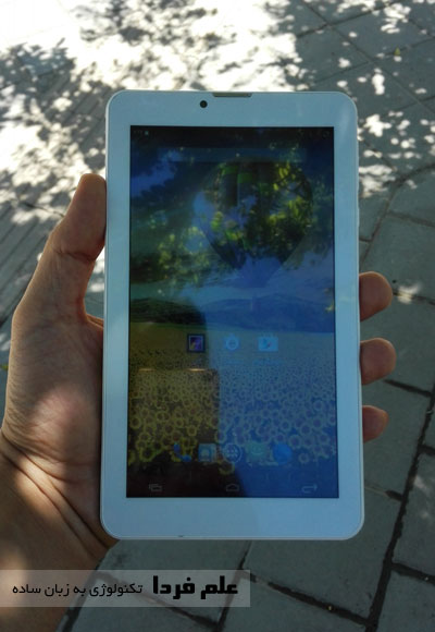صفحه نمایش تبلت اسمارت رونیکس 874 در محیط باز و نور آفتاب خیلی خوب دیده نمیشه اما توی سایه مشکلی وجود نداره . نمایشگر بازتاب نور داره که توی این قیمت ، طبیعیه .