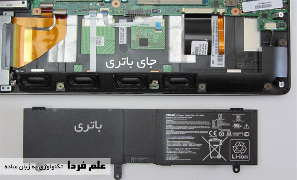 باتری لپ تاپ ایسوس N550jk از نوع ۴ سلولی و داخلی است و برای تعویض باتری در N550jk باید درب پشت باز بشه و پیچ باتری باز شه . باتری N550jk از نوع لیتیوم پلیمری هست که امکان تخت بودن رو به خودش می ده ( گرد نیست ، مثل باتری تبلت و گوشی میمونه ) .