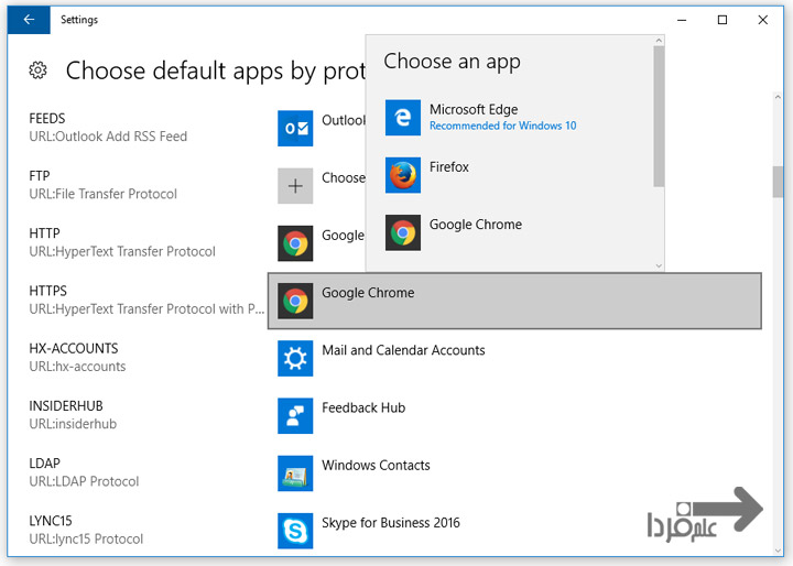 ■ برای تغییر برنامه پیش فرض مربوط به پروتکل مورد نظر میتونید روی آیکن برنامه پیش فرض کلیک کنید . همونطور که میبینید یه منیو باز میشه که فهرست برنامه های مرتبط با اون پروتکل نمایش داده میشه و شما می تونید برنامه مورد نظر تون رو انتخاب کنید.