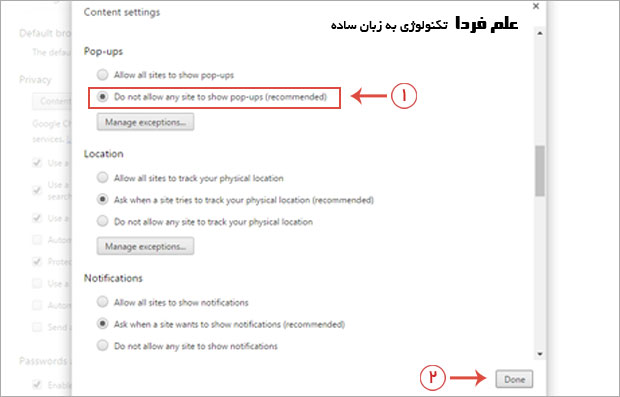 ■ در پنجره Content settings برید به قسمت Pop-ups و از اونجا گزینه « Do not allow any sites to show pop-ups » رو کلیک کنید . و در نهایت روی دکمه Done کلیک کنید .