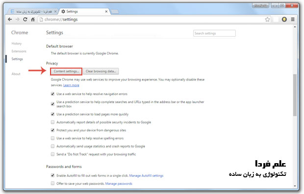 ■ از قسمت Privacy روی دکمه Content settings کلیک کنید .