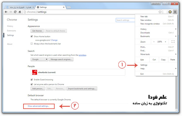 ■ از قسمت سمت راست و بالای صفحه مرورگر گوگل کروم ، روی آیکن 3 خط کلیک کنید و بعد روی گزینه settings کلیک کنید .