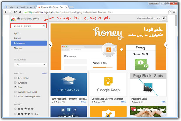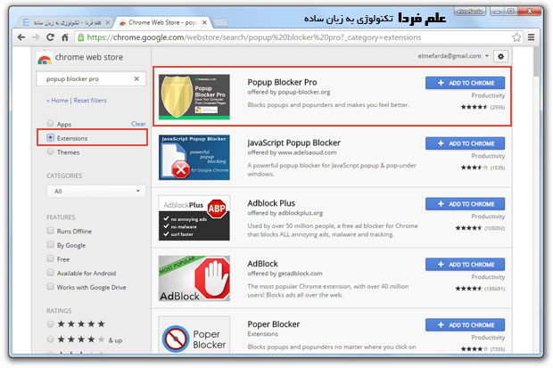 ■ از منیوی سمت چپ اول روی گزینه Extensions کلیک کنید تا آبی بشه و بعد در کادر متنی Search the webstore عبارت Popup blocker pro رو تایپ کنید و بعد کلید Enter بزنید .