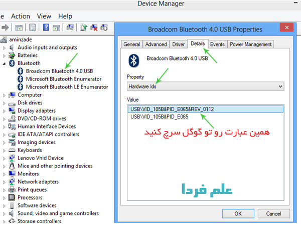 شرکت هایی که این چیپ ست ها رو تولید می کنن کمن که در ادامه اسم شون رو می بینید : ■ اینتل ■ کوالکام ( Qualcom ) و Atheros که قبلا جداگونه کار میکردن و الان باهم یکی شدن . در واقع کوالکام شرکت Atheros رو خرید . ■ Broadcom ■ رالینک ( Ralink ) ■ Realtek در اکثر لپ تاپ ها این اسم ها رو در مورد وای فای و بلوتوث می بینید . برای نصب درایور بلوتوث باید بدونید که در لپ تاپ شما کدوم ماژول بلوتوث قرار گرفته . برخی لپ تاپ ها در ابتدای روشن شدن ، اگر دکمه f1 رو بزنید یک سری اطلاعات در مورد قطعات سخت افزاری لپ تاپ میدن . مثلا FCC ID مربوط به ماژول وای فای یا بلوتوث لپ تاپ رو نشون میده . اگه اون FCC ID رو گوگل کنید شرکت سازنده ماژول بلوتوث لپ تاپ تون مشخص میشه . در غیر اینصورت باید از نرم افزارهای جانبی که برای تشخیص و عیب یابی سخت افزارهای داخل کامپیوتر طراحی شدن استفاده کنید . ولی شاید بهترین راه ، پیدا کردن VEN ID ماژول ها باشه . برای این کار به Device Manager برید و روی دستگاهی که نصب نشده کلیک راست کنید و properties رو بزنید و بعد در تب details برید و گزینه property رو به Hardware id تغییر بدید. شکل زیر :