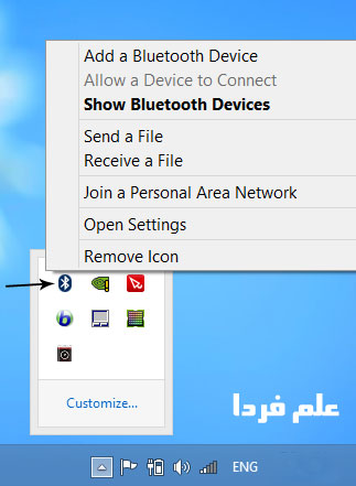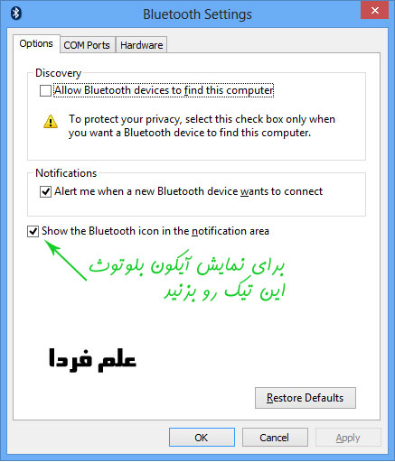 در این قسمت ( تب Options ) گزینه اول میگه ” اجازه بده دستگاه های دیگه که بلوتوث دارن ، این کامپیوتر رو پیدا کنن ” که برای امنیت بیشتر ترجیحا این گزینه رو تیک نزنید ( گفتم نزنید ) . گزینه دوم میگه ” اجازه بده دستگاه های دیگه به این کامپیوتر متصل بشن ” که این گزینه رو باید تیک بزنید . مهمترین گزینه ، گزینه آخر هست که تیکش رو باید بزنید . تیک آخر میگه ” آیکون بلوتوث رو در قسمت تسک بار نشون بده ” . مشکل خیلی از کاربران همین تیک هست که آیکون بلوتوث لپ تاپ رو میاره جلوی چشمتون . با فعال کردن گزینه نمایش آیکون ، آیکون بلوتوث در سمت راست پایین صفحه نمایش داده میشه که با کلیک روی اون می تونید دستگاه های مورد نظر خودتون رو پیدا و اضافه کنید و فایل های خودتون رو دریافت یا ارسال کنید .