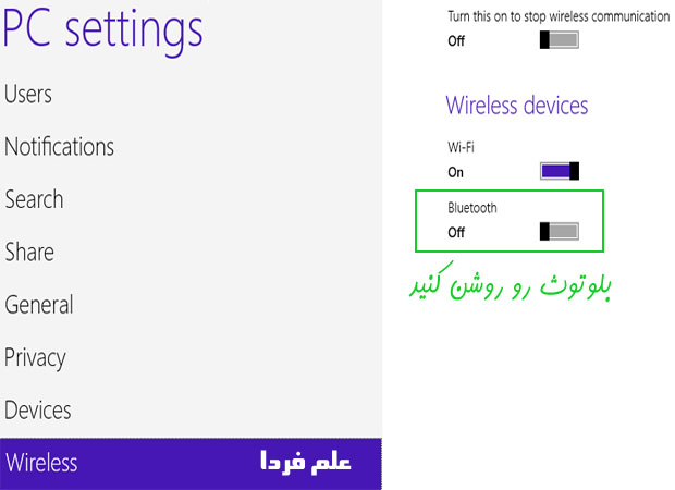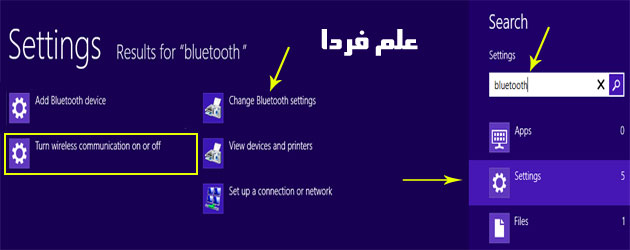 خیلی از کاربران لپ تاپ ، با وجود اینکه درایور بلوتوث لپ تاپ شون نصبه باز هم نمی دونن چجوری باید فعالش کنن و بلوتوث رد و بدل کنن . برای روشن کردن بلوتوث لپ تاپ در ویندوز 8 ابتدا دکمه Win روی کیبورد ( حوالی دکمه space ) رو بزنید و عبارت Bluetooth رو جستجو کنید . تصویری مثل شکل زیر باید ببینید .