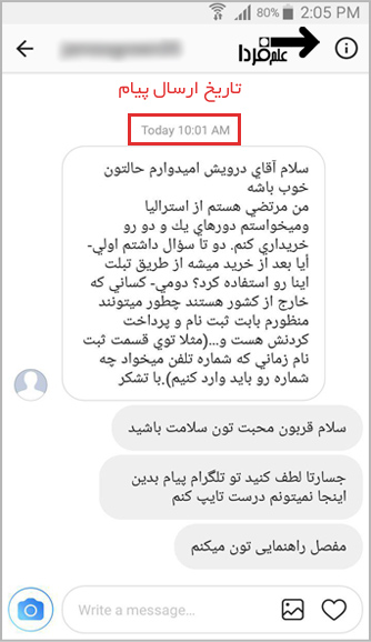 خیلی از کاربران اینستاگرام (حداقل مبتدی ها ) نمیدونن که زمان ارسال پیام چقدر در دسترسه و حتی دیدم که بعضیا فک میکنن اصلا تو دایرکت اینستاگرام زمان ارسال پیام اصلا درج نمیشه دلیلش هم اینه که زمان ارسال پیام در کنار پیام نمایش داده نمیشه! خب پس کجاست ؟! خیییییلی دم دسته؛ فقط کافیه روی صفحه انگلشت تونو از سمت راست به چپ بکشید ، همین ! خب همونطور که ملاحظه میکنید زمان ارسال پیام به طور دقیق در کنار هر پیام نمایش داده میشه. 😀