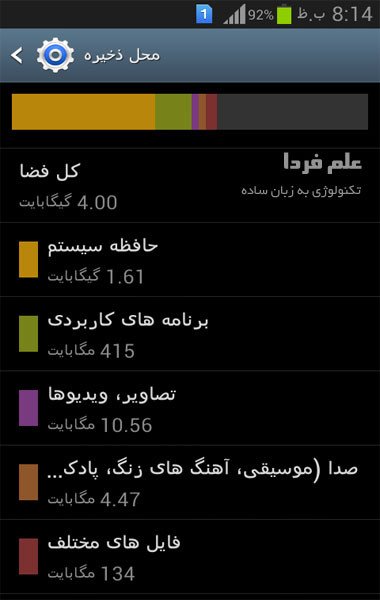 ضمنا شما می تونید برید تو قسمت محل ذخیره گوشی و ببینید که چقدر فضا دارید و چه چیزهایی بیشترین و کمترین حجم رو گرفتن . محیطش تو اندروید مثل شکل زیر می مونه .