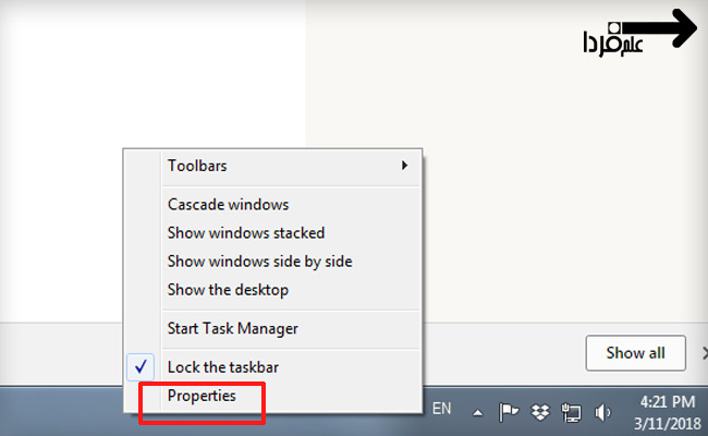 واسه اینکه آیکون باتری رو توی ویندوز 7 و 8 بیارید روی تسک بار راست کلیک کنید و گزینه Properties رو بزنید.