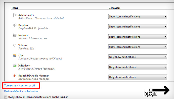 حالا تو قسمت Taskbar اسکرول کنید و گزینه Turn system icons on or off رو بزنید .