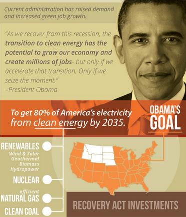 هدف اوباما در دوره ریاست جمهوری خود ، استفاده از انرژی پاک در 6 ایالت آمریکاست . آمریکا قصد داره تا سال 2035 ، 80 درصد کشورش رو با انرژی پاک تغذیه کنه . منظور از انرژی پاک ، انرژی های تجدید شدنی مثل خورشید و باد ، حرارت مرکزی زمین و… ، انرژی هسته ای ، گاز طبیعی و سوخت پاک هست . دولت اوباما تا الان حدود 90 میلیارد دلار در زمینه انرژی پاک سرمایه گذاری کرده و هدفشون دو برابر کردن انرژی های تجدیدپذیر از سال 2008 تا سال 2012 هستش .