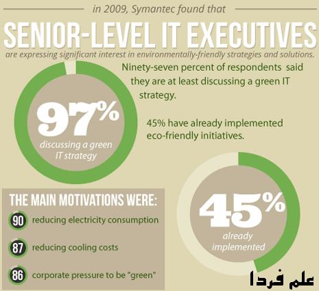 در سال 2009 مححقان دریافتند که مدیران اجرایی شرکت ها ، از تکنولوژی سبز غافل نیستند . به طوری که97 درصد آنها گفتند که حداقل در مورد استراتژی تکنولوژی سبز بحث می کنیم و 45 درصد نیز برای محصولات خود از این قضیه استفاه می کنند . بیشترین انگزه ها برای استفاده از انرژی پاک :