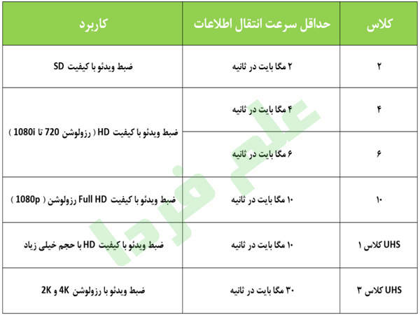 رم موبایل کلاس ۲ می تونه ۲ مگابایت در ثانیه دیتا جابجا کنه . یعنی فایل موزیک ۳ مگابایتی رو در ۱٫۵ ثانیه جابجا میکنه . رم موبایل کلاس ۱۰ می تونه در ثانیه ۱۰ مگابایت رو انتقال بده . البته این مقادیر ، حداقل هستن یعنی رم موبایل کلاس ۱۰ می تونه دیتا رو با سرعت ۱۳ یا ۱۵ مگابایت بر ثانیه هم جابجا کنه. جدول زیر رو ببینید :