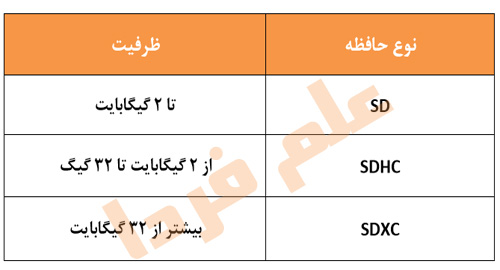 به طور کلی ۳ دسته بندی داریم . ۱ – SD معمولی ۲ – SDHC که HC مخفف عبارت High Capacity هست . ۳ – SDXC که XC مخفف عبارت eXtra Capacity هست . جدول زیر رو نگاه کنید :