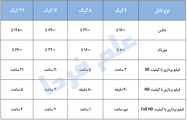 مقدار پیشنهادی من ، رم ۸ گیگ و ۱۶ گیگ اون هم کلاس ۱۰ هست چون تقریبا میشه تعداد زیادی فایل رو با سرعت بالا داخلشون ذخیره کرد . اما قبل از خرید رم موبایل ، حتما مشخصات گوشی موبایل خودتون رو چک کنید و ببینید که چه مقدار رم رو ساپورت می کنه . یعنی اینجوری نیست که هر رمی با هر ظرفیتی بتونید استفاده کنید . البته گوشی های جدید اکثرا تا ۳۲ گیگ رو پشتیبانی می کنن ( رم های SDHC ) . در جدول زیر می تونید ببینید که مقادیر مختلف حافظه رم موبایل چقدر اطلاعات رو می تونه در خودش جا بده :