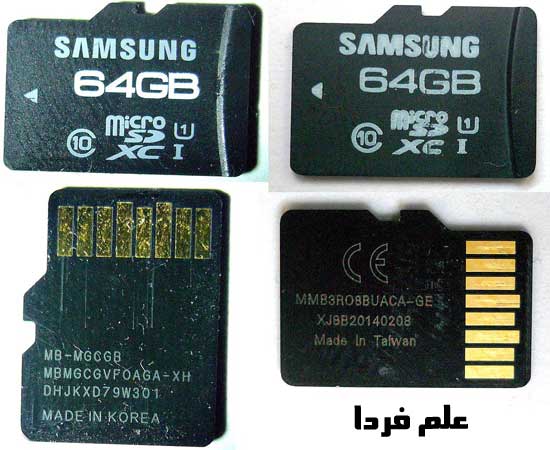 در شکل زیر رم موبایل سمت راست تقلبی است . ظرفیتش ۶۴ گیگابایت نوشته اما در اصل ۸ گیگه و کلاس ۱۰ نوشته در حالیکه کلاس ۴ هست .