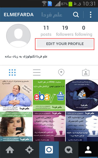 واسه این کار صفحه اول اینستاگرام رو که باز میکنید پایین گوشه ی سمت راست آیکون آدم می بینید ، روی اون ضربه بزنید تا صفحه شخصی خودتون رو ببینید حالا روی Edit Your Profile ضربه بزنید .