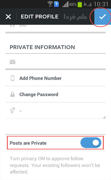 الان اطلاعات پروفایل تون رو می بینید . انتهای صفحه پروفایل نوشته Posts are Private . این قابلیت رو باید فعال کنید . کنارش یه اسلایدر می بینید اونو اگه به سمت راست ببرید رنگش آبی میشه ، حالا از بالای صفحه تیک آبی رنگ رو بزنید ( در شکل زیر مشخص کردم ) یه پیغام میاد که آقا/خانم آیا مطمئنید که می خواید اینستاگرام رو خصوصی کنید و شما هم I’m Sure رو بزنید . از این به بعد پروفایل اینستاگرام شما private یا خصوصی شده .