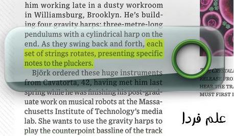 با این وسیله جالبی که در تصویر می بینید هر نوع نوشته و در هر کتاب و دفتری که می بینید را به سادگی شناسایی و در شبکه های اجتماعی منتشر کنید . این گجت شیشه ای یک حفره در سمت راست جهت هدایت و کنترل جملات دارد ، به اینترنت وصل می شود و دارای یک میکرو لنز و سیستم شناسایی کارکتر می باشد . برای شناسایی کلمات کتاب کاغذی کافیست آن را روی نوشته گذاشته با استفاده از انگشت خود و حفره سبز رنگ ، نشانگر را بر روی ابتدای عبارت مورد نظر قرار دهید و سپس با انگشت خود تا انتهای آن عبارت بکشید . مشاهده می شود که عبارت مد نظر شما به رنگ سبز ( highlight ) درآمد . با کشیدن و بالا انداختن عبارت ، به صورت خودکار به شبکه اجتماعی مورد نظر شما ارسال می شود یا اینکه می توانید عبارت را در سرویس حافظه ابری که در اختیارتان قرار می گیرد ذخیره کنید .