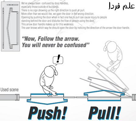 حتما برای همه ما پیش اومده که وقتی قصد ورود به مغازه را داریم نمی دانیم درب را بکشیم یا هل دهیم . هرچند بسیاری از صاحبان مشاغل بر روی درب شیشه ای مغازه خود واژه های ” فشار دهید ” و یا ” بکشید ” را می چسبانند که راهنمای بدی نیست اما دستگیره های جالبی طراحی و ساخته شده که هم دستگیره هستند و هم نیاز به چسباندن کاغذ روی درب را از بین می برند . همانطور که در تصویر می بینید این دستگیره ها در یک طرف میله صاف و در طرف دیگر میله ای به شکل فلش دارند که این فلش به شما جهت صحیح باز شدن درب را می گوید . چندی پیش کلیپی دیدم در مورد مقایسه هوش خانمها و آقایان که خانم بنده خدا نمی تونست درب رو باز کنه و بعد از کلی بکش مکش و کشتی گرفتن با در، یک آقایی به سادگی درب رو باز می کنه . اگر اونموقع این دستگیره ها بودند شاید این کلیپ هم ساخته نمی شد .