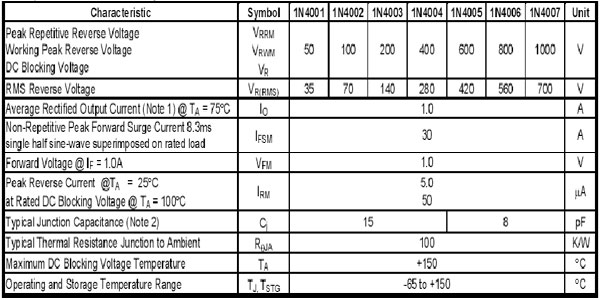 جدول مشخصات دیود 1N4001 تا 1N4007