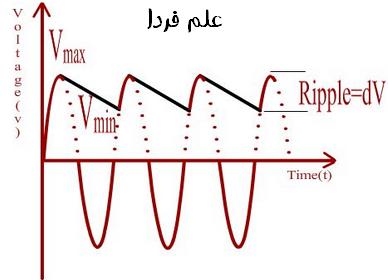 البته این شکل برای موقعی است که فقط از یک دیود در مسیر شکل موج AC استفاده بشه . با قرار دادن دو یا 4 دیود 1N4001 ، یه یکسوساز تمام موج سر وسط و یا پل می رسیم . با قرار دادن یک خازن با ظرفیتی محاسبه شده ، شکل موج را به شکلی مطلوب در می آورند که در زیر می بینید . این شکل همان سیگنال یکسو شده و صاف شده ایست که به مصرف کننده ارسال می شود . به اعوجاج کوچکی که در شکل موج می بینید ، ریپل می گن و این ریپل در بسیاری از مواقع انقدر کوچیکه که میشه نادیده گرفتش . اساس کار این شکل موج ریپل که همون سیگنال dc رو میسازه بر شارژ و دشارژ خازن هست . به این شکل که در نیم موج مثبت شارژ و در نیم موج منفی دشارژ میشه . اما طبق ثابت زمانی خازن مدتی برای این شارژ و دشارژ طول میکشه ، به زبان ساده تر اگه به شکل با دقت بیشتری نگاه کنید می بینید که تا خازن می خواد شارژ شه باید دشارژ شه و تا می خواد دشارژ شه باید شارژ شه . اینجوریه که به شکل موج نسبتا صافی می رسیم .