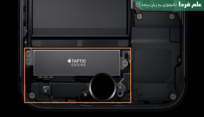 دکمه هوم آیفون 7 یه کلید خازنی هست . یعنی با اندازه گیری میدان مغناطیسی انگشت شما ، سنسور متوجه تغییر در اندازه میدان مغناطیسی میشه و عمل سوئیچ نجام میشه . البته پشت دکمه هوم آیفون 7 یه ریزپردازنده قرار داره ، منظورم اینه که یه کلید ساده نیست . قبلا به طور مفصل توضیح دادم که تکنولوژی فورس تاچ در مک بوک و تکنولوژی 3D Touch در آیفون 6 اس چجوری کار میکنن . یه موتور فیدبکی داره که به کاربر حس فشار دادن کلید هوم رو منتقل میکنه . یعنی واقعیت اینه که اون کلید اصلا از نظر فیزیکی تکون نمی خوره اما یه موتور لرزشی داره که مقدار لرزشش هم قابل تنظیمه . یعنی تو 3 تا مرحله شدت فیدبک تنظیم میشه . اون موتور لرزشیه اسمش Taptic Engine هست .