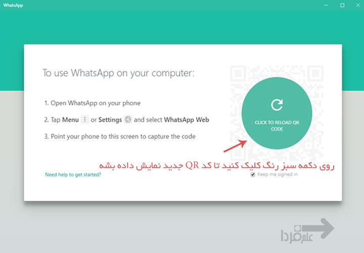 ■ بعدش برنامه واتساپ رو هم روی کامپیوتر تون باز کنید. بعد از چند ثانیه یه کد QR ظاهر میشه. اگر دقت کنید میبینید زیر کد QR یه گزینه هست که میتونید تیک بزنید نوشته keep me signed in اگه میخواید واتساپ کامپیوترتون همیشه فعال باشه این گزینه رو تیک بزنید (به طور پیش فرض تیک خورده). اما اگه میخواید موقتی استفاده کنید یا کامپیوتر مال خودتون نیست این تیک رو بدارید. اینو باید عرض کنم که اگه این گزینه تیک خورد باشه هر وقت که واتساپ گوشی تون فعال باشه (به اینترنت وصل باشه) واتساپ کامپیوتر تون هم فعال میشه. اگه کامپیوتر مال خودتون نیست به هیچ وجه این گزینه رو تیک نزنید!