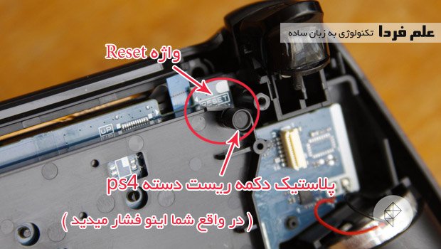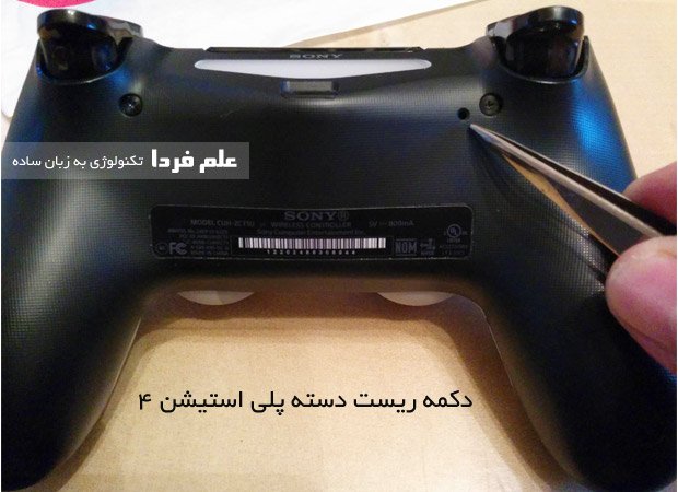 3 – محلی که دکمه ریست قرار گرفته رو پیدا کنید . پشت دسته PS4 رو که نگاه کنید یه حفره ریز سمت راست بالا ( شمال شرقی دسته ) بغل پیچ .