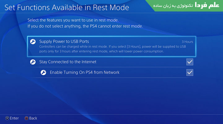 موقعی که شما بازی می کنید ، شارژ دسته کم میشه ، اگه دستگاه رو خاموش کنید ، دیگه نمی تونید دسته پلی استیشن 4 رو شارژ کنید اما اگه PS4 رو در حالت استندبای یا Rest Mode بذارید ، دسته شارژ میشه . البته باید یه گزینه رو از توی تنظیمات فعال کنید . به تنظیمات برید و گزینه Power Save Settings رو بزنید و از اونجا گزینه Set Features Available in Rest Mode و بعدش هم Supply Power to USB Ports رو فعال کنید . اینجوری ، موقعی که پلی 4 در حالت استندبای هست ، می تونید دسته ps4 رو شارژ کنید .