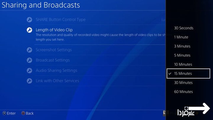 تو گزینه دوم منیوی اصلی share ، شما میتونید تایم ضبط ویدیو از بازی رو مشخص کنید ، به صورت دیفالت یعنی پیش فرض ، تایم ضبط بازی در PS4 روی 15 دقیقه تنظیم شده اما شما میتونید از 30 ثانیه تا یه ساعت ، زمان ذخیره بازی رو تنظیم کنید . واسه اینکار گزینه Length of video clip رو بزنید .