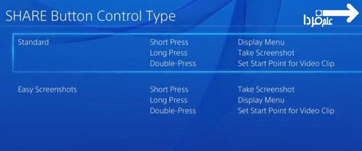 واسه ضبط بازی در پلی استیشن اول از همه باید تنظیمات ذخیره سازی رو انجام بدین ، واسه اینکار دکمه share رو بزنین و نگه دارین تا تنظیمات share باز بشه ، اینجا قبل از هر چیز میتونید تنظیم کنید که چجوری دکمه share رو وسط بازی بزنید تا بتونید عکس یا فیلم بازی رو ذخیره کنید . به صورت پیش فرض گزینه اول یعنی share button control type روی حالت Standard هستش .