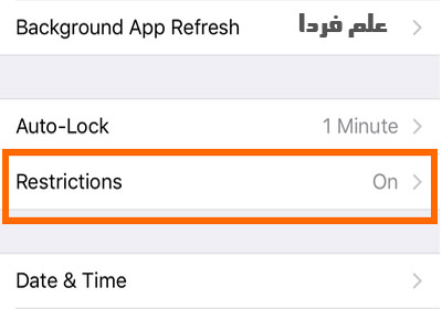 ■ در صفحه Restrictions روی گزینه Enable restrictions ضربه بزنید تا بتونید روی برنامه های مورد نظر تون محدودیت اعمال کنید . البته اگر قبلا restrictions رو فعال کرده باشید در این قسمت می نویسه Disable restriction که در این صورت نیازی به تغییر این قسمت نیست .
