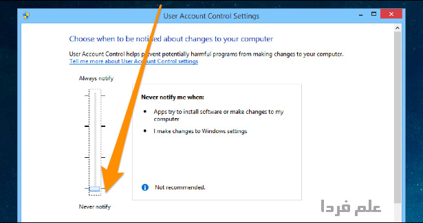 وقتی این گزینه رو انتخاب می کنید دیگه UAC کلا دست از سرتون بر می داره و هیچ پیغامی نمیده . اگر برنامه های ویندوزی یا غیر ویندوزی بخوان هر تغییری رو سیستم تون ایجاد کنن UAC ویندوز هیچ پیغامی نمیده . برای غیر فعال کردن این پیغام ها باید این گزینه رو انتخاب کنید .