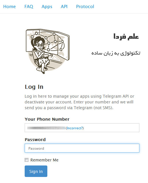 ■ بعد از اینکه دکمه Next رو زدین ، یه رمز عبور ( Password ) به تلگرام تون ارسال میشه . در صفحه بعدی دو تا کادر متنی نمایش داده میشه که یکیش شماره تلفن تون رو نمایش میده و زیرش یه کادر متنی دیگه هم هست که باید رمز عبوری که براتون ارسال شده رو وارد کنید و بعد روی دکمه Sign in کلیک کنید .