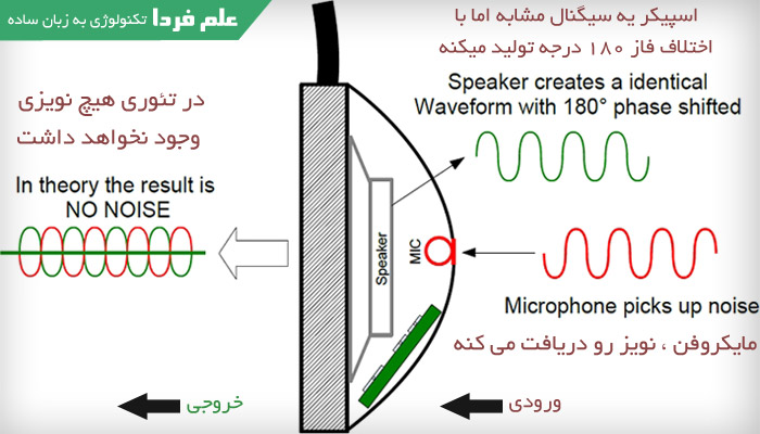 طرز کار Noise Cancelation اینجوریه که نویز توسط میکروفن گرفته میشه و به مدار الکترونیکی ارسال میشه ، اون مدار یه سیگنال با همون فرکانس میسازه اما 180 درجه اختلاف فاز دارن . توی الکترونیک موقعی که دو تا سیگنال با اختلاف فاز رو با هم جمع کنیم ، همدیگه رو خنثی میکنن . اینجوری در تئوری میشه گفت که یه سیگنال خنثی شده و صاف تحویل میگیریم . البته تو عمل اینجوری نمیشه و بازهم یه مقدار نویز باقی می مونه . عکس زیر رو ببینید .