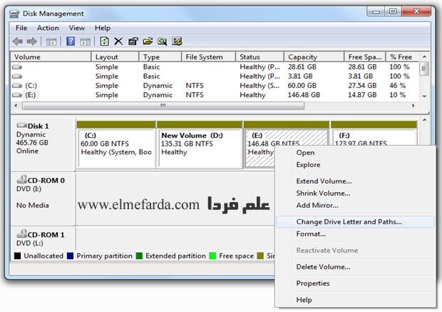 ■ حالا در این قسمت روی درایو ( پارتیشن ) مورد نظر تون راست کلیک کنید و بعد روی گزینه Change drive letter کلیک کنید .