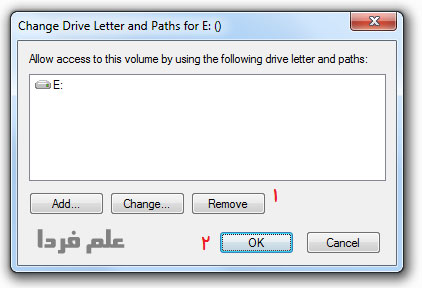 ■ در پنجره change drive letter می تونید نام پارتیشن ( درایو ) مورد نظر تون رو ببینید . چنتا دکمه هم زیرش قرار دارن . روی دکمه remove کلیک کنید . وقتی روی این دکمه کلیک میکنید ، ویندوز بهتون هشدار میده که اگر نام این پارتیشن رو حذف کنید ، برنامه هایی که در این پارتیشن نصب کردین ممکنه قابل دسترسی نباشن . شما گزینه Yes رو انتخاب کنید .