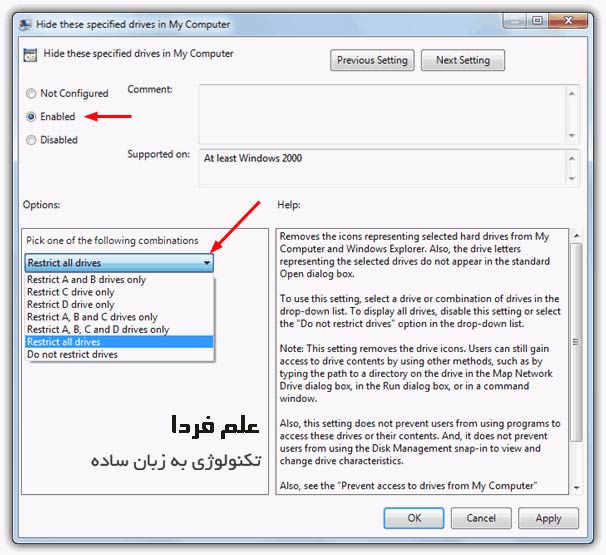 ■ در سمت چپ پنجره ای که باز شده 3 تا گزینه وجود داره با عنوان Not configured , Enabled و Disabled . شما گزینه Enabled رو انتخاب کنید . وقتی Enabled رو انتخاب می کنید در زیر این گزینه ها ( در کادر Option ) یه مینوی کشوی ظاهر میشه . در این منیو چنتا گزینه وجود داره که هر کدوم یه امکانی رو بهتون میده . واژه Restrict یعنی محدود کردن ، پس گزینه Restrict c drive یعنی محدود کردن درایو C . گزینه یکی مونده به آخر Restrict all drives میگه همه درایو ها رو مخفی کن و گزینه آخر مDo not restrict drives یعنی هیچکدوم از درایو ها رو محدود نکن . گزینه مورد نظر تون رو انتخاب کنید و در آخر روی دکمه OK کلیک کنید .