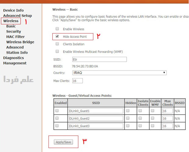 ■ در خیلی از مودم ها مثه مودم های دی لینک می تونید گزینه Hide access point یا Hide SSID و یا Broadcast SSID رو در همین صفحه تنظیمات وای فای ببینید و اگر نبود در قسمت Security زیر مجموعه WiFi settings می تونید پیداش کنید . برای یادآوری عرض می کنم واژه Hide با Broadcast یکم فرق دارن !