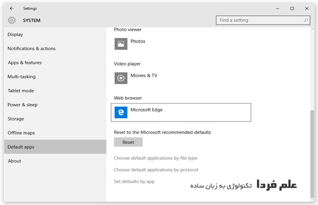 با درود. من جدید مجبور به تعوض کامپیوتر و دریافت ویندوز 10 شدم و ظاهرن این مراحل نیست و در setting —> system —> defult app وجود ندارد و باید در setting مستقیم گزینه apps را انتخاب کنید و به مراحل بعدی که گفتید برسیم