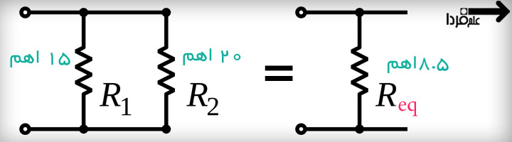 مثلا تو شکل زیر دو تا مقاومت موازی داریم ، یکی 15 اهم و یکی هم 20 اهم . واسه بدست اوردن مقاومت معادل این دو تا ، طبق فرمول بالا اول تو هم ضرب شون میکنیم که میشه 300 ، حالا با هم جمعشون میکنیم که میشه 35 . حالا 300 تقسیم بر 35 میشه 8.5 . پس مقاومت معادل این دو تا مقاومت موازی میشه 8.5 اهم . یعنی شما چه دو تا مقاومت 20 و 15 اهمی رو با هم موازی کنید و چه فقط یه دونه مقاومت 8.5 اهمی بذارید فرقی نمیکنه !