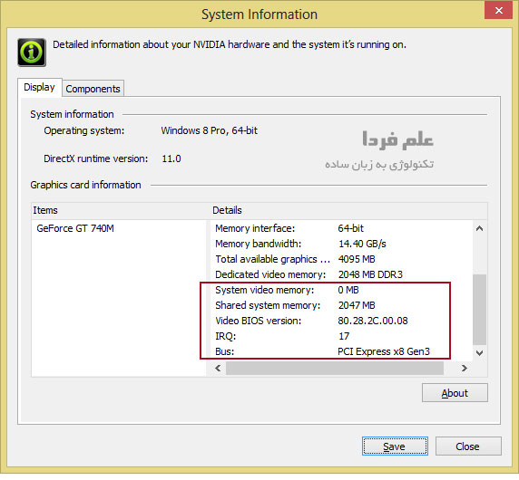 Dedicated Video memory : این عبارت میزان گرافیک انویدیا رو نشون میده ( دقیقا همون چیزی که توی تبلیغات یا مشخصات گرافیک میزنه ) گرافیک ۷۴۰m حافظه اختصاصی ۲ گیگ داره که اینجا هم ۲ گیگ زده .