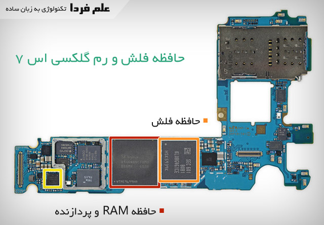 ببینید معنی هارد رو که دیگه همه می دونن یعنی ” سخت ” . هارد درایو یعنی درایو سخت ، یعنی درایوی که قطعات سخت و خشن داره ، قطعه مکانیکی داره . هارد هم نوعی حافظه است اما در مورد گوشی و تبلت به کار نمیره . تبلت و گوشی موبایل ، حافظه فلش Flash دارن . یعنی یه جورایی مثل حافظه SSD و یا حافظه فلش مموری هستش فقط حجم و قیافش شاید فرق بکنه وگرنه اساس کارش همونه . در شکل زیر حافظه فلش گوشی گلکسی اس 7 رو می بینید . اون نارنجیه ، حافظه فلش یا همون حافظه داخلی اس 7 هست و اون قرمزه هم پردازنده و زیرش حافظه RAM گوشی هست . می بینید که خبری از هارد گوشی نیست !