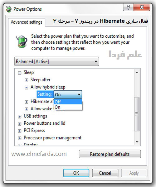 خیلیا رو دیدم که برای فعال سازی هایربنیت Hibernate در ویندوز 7 نصف راه رو درست میرن ولی آخرش بازم به خاطر یه اشتباه به نتیجه نمی رسن ! خب از این حرفا بگذریم و بریم سر اصل مطلب ! برای شروع ابتدا به کنترل پنل Control Panel برید و روی گزینه Power Options کلیک کنید تا به صفحه مربوط به تنظیمات برق رسانی سیستم تون وارد بشید . در سمت راست پنجره باز شده قسمتی وجود داره با عنوان Preferred Plans در این قسمت روی گزینه Change plan settings کلیک کنید و بعد در پنجره باز شده روی گزینه Change advanced settings کلیک کنید تا پنجره Power Options باز شه . در این پنجره روی گزینه Sleep کلیک کنید و از لیست باز شده روی گزینه Allow hybrid sleep کلیک کنید و مقدار این گزینه رو ، روی Off تنظیم کنید و در آخر هم روی دکمه Ok کلیک کنید تا تنظیمات جدید ذخیره بشه ! همین ، تموم شد ! اگر گزینه Allow hybrid sleep رو on تنظیم بشه ، دکمه هایبرنیت Hibernate در لیست Shut Down ویندوز 7 غیر فعال میشه ! دلیل اینکه خیلیا دکمه هایبرنیت Hibernate رو در لیست Shut Down ویندوز 7 نمی بینن همینه 😀
