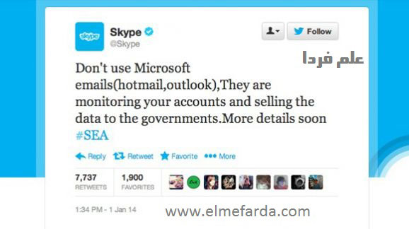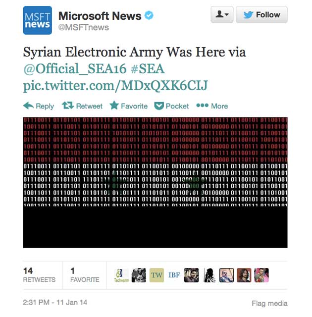 تاریخ انتشار : ۲۴ دی ۱۳۹۲یک گروه هکر حرفه ای با عنوان Syrian Electronic Army یا « ارتش الکترونیکی سوریه » در 11 January 2014 وبلاگ رسمی مایکروسافت رو هک کردن ! این اقدام 11 روز بعد از هایجک Hijack سرویس اسکایپ Skype توسط همین گروه انجام شده . اولین نشانه های این هک جدید یک پیام در اخبار فوری در توییتر بود که توسط ارتش الکترونیکی سوریه منتشر شد و گفته بودن که مایکروسافت کاربران Outlook یا Hotmail و Skype رو مانیتور می کنه (تحت نظر می گیره ) و در این پیام با لحن هشداری گفته بودن که « ارتش الکترونیکی سوریه اینجاست ! » .