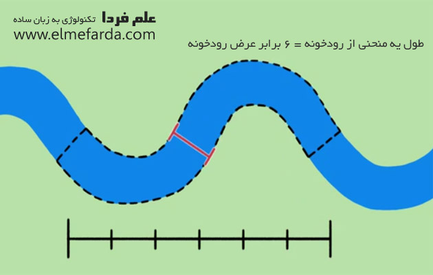 هرچی رودخونه پهن تر باشه ، تعداد منحنی هایی که در طول مسیر بوجود میاره کم تره چون فاصله بین ضربه زدن آب به کناره ها بیشنر میشه . یه اصلی تو محاسبه منحنی S شکلِ رودخانه ها هست . طول اون منحنی میشه ۶ برابر عرض رودخونه ( ۳ ثانیه به جمله فکر کنین متوجه میشین ) شکل زیر :
