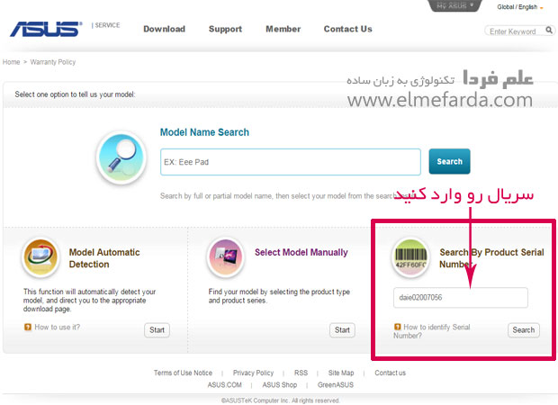 واسه اینکه بعد از خرید از فحش دادن به فروشنده جلوگیری کنید و خیال خودتون هم راحت بشه به سادگی سریال محصولات ایسوس رو در این لینک چک کنید . تو این صفحه سمت راست ۱ کادر هست که تو عکس مشخص کردم . اینجا اگه سریال محصولات ایسوس رو وارد کنید و اگه سریال معتبر باشه ، محصول شما رو حالا تبلت ، لپ تاپ ، مودم و … نشون میده مدلش رو هم می زنه . امتحان کنید .با این کار می تونید بفهمید که محصول شما اصله یا تقلبیه !