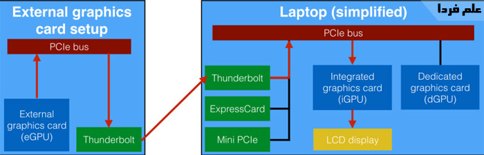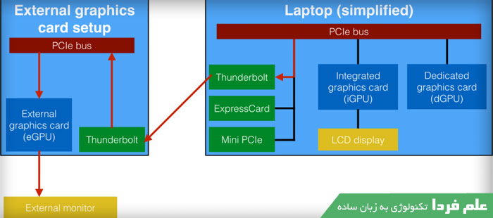 حالا اینجا یه سوالی پیش میاد اونم اینکه اگه کارت گرافیک اکسترنال در لپ تاپ استفاده کنیم اونوقت چجوری تصویر رو روی لپ تاپ ببینیم ؟ ببینید ، شما هر چندتا گرافیک هم که در لپ تاپ داشته باشید یا به صورت خارجی به لپ تاپ وصل کنید ، باز هم باید اطلاعات از طریق گرافیک مجتمع به نمایشگر ارسال بشه . یعنی کارت گرافیک اکسترنال تمام پردازش ها رو انجام میده و اطلاعات رو روی باس خودش می فرسته ، این اطلاعات از طریق پورت تاندربولت یا پورت USB-C به لپ تاپ منتقل میشه و از اونجا از طریق باس PCI Express به گرافیک مجتمع و از گرافیک مجتمع هم به نمایشگر منتقل میشه .
